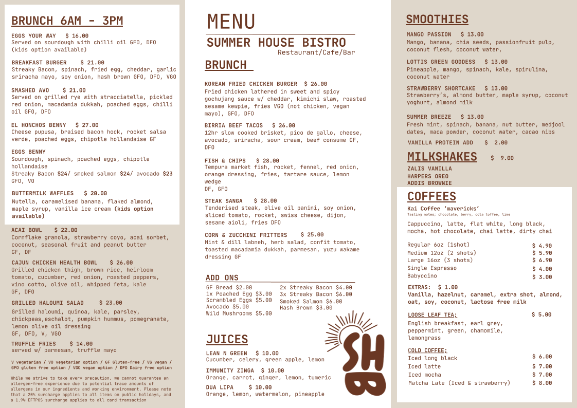 Welcome to Summer House Bistro, a delightful café nestled by the beautiful lake at 1 Innovation Pkwy, Birtinya QLD. This charming eatery combines a warm, inviting atmosphere with a menu that creatively reinterprets classic café dishes. Highlights include the crowd-pleasing Korean Chicken Burger and the flavorful Cajun Chicken Health Bowl, both flawlessly executed with locally sourced ingredients.